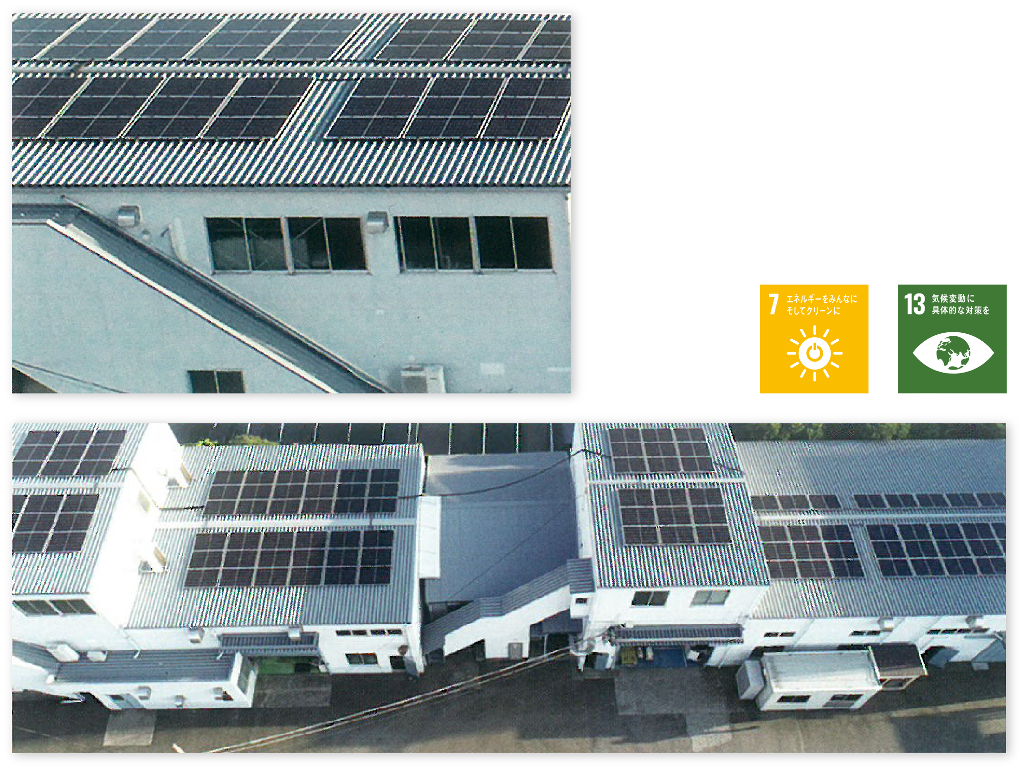 自社工場の屋根に太陽光パネルを設置し、再生可能エネルギーの導入を実現しております。
