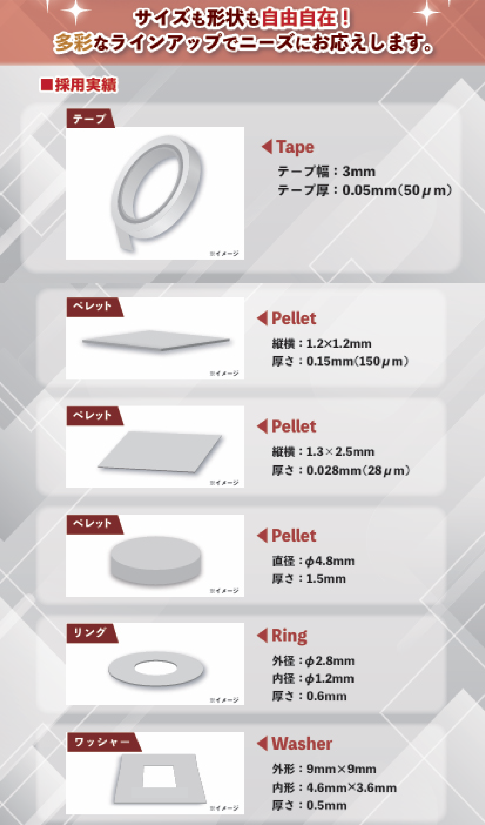 チップ部品や端子部など、狙った部分のみに確実なはんだ付けを行うための「プリフォーム(定形はんだ)」です。 リング、ワッシャー、ディスク、チップ、テープなど、多彩な形状に対応可能です。 少量試作から量産対応まで、柔軟にご要望にお応えします。