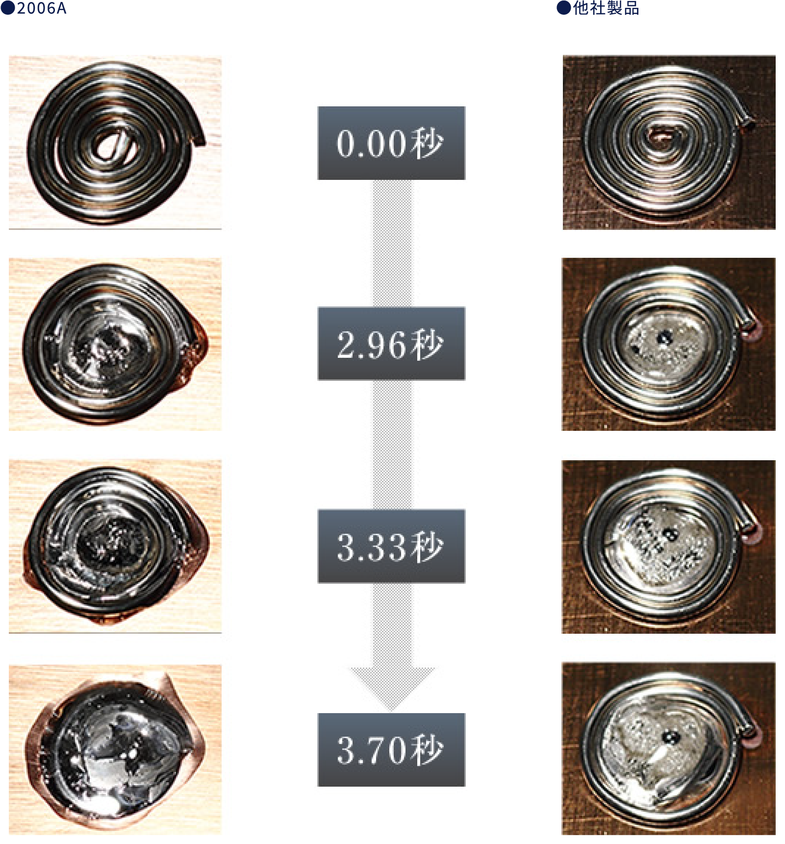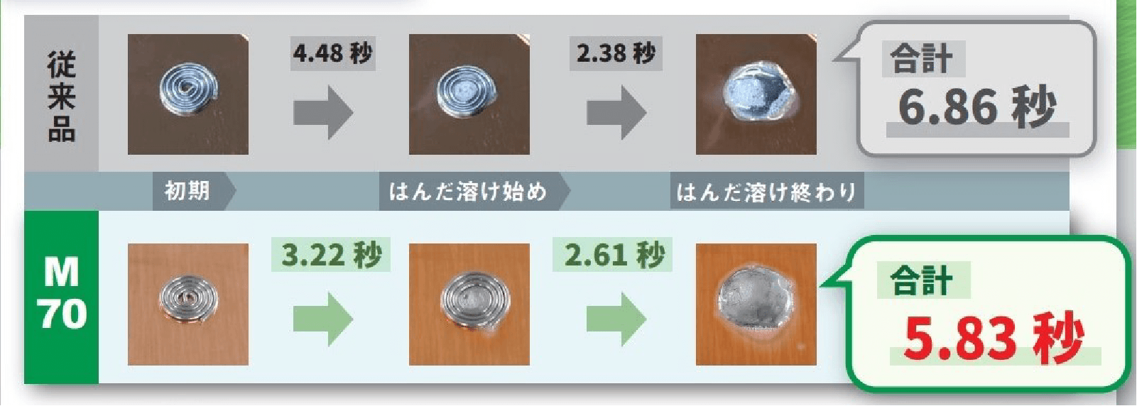 フラックスを改良した事により、初期漏れ(溶け出しのスピード)が速くなりました。低温域でも作業性が良好です。