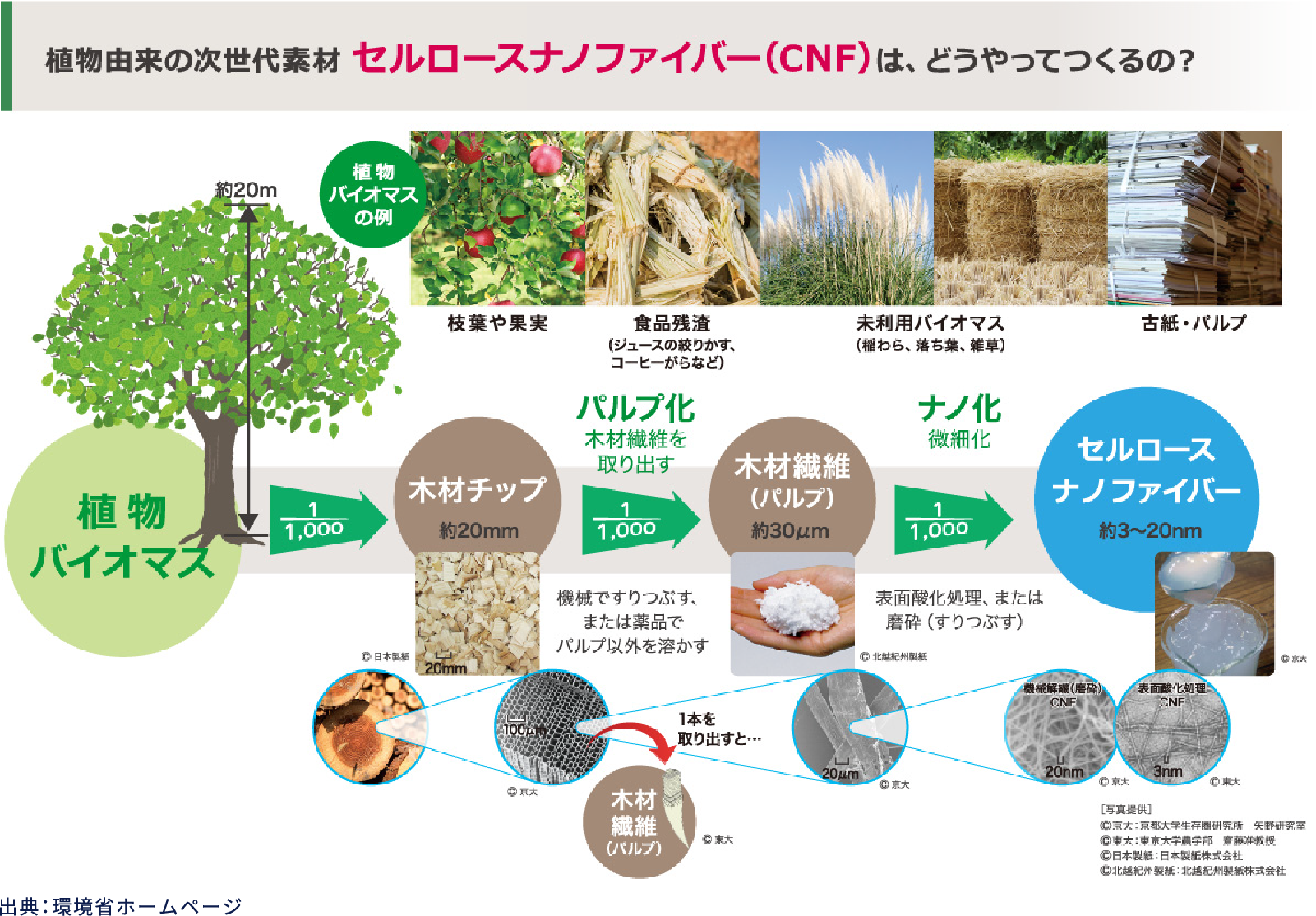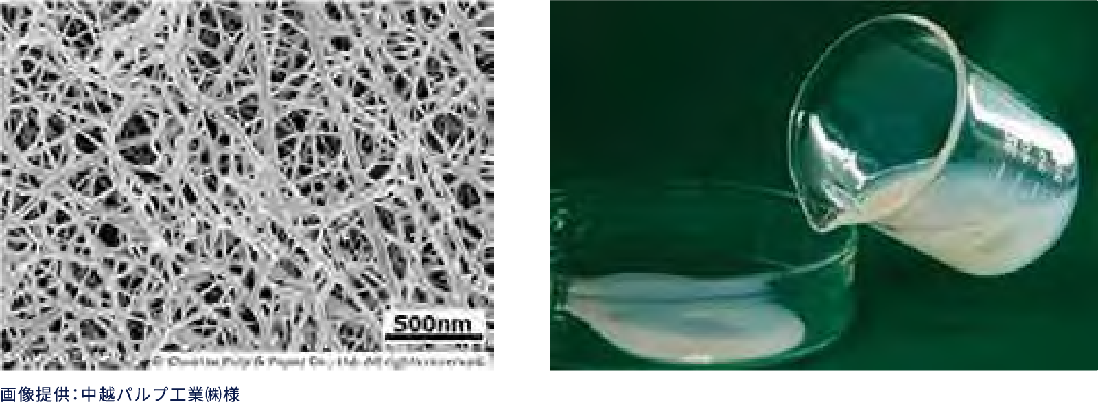 セルロースナノファイバーとは…植物由来の次世代素材です。一般的に、重さは鉄の1/5、強度は鉄の5倍と言われています。
