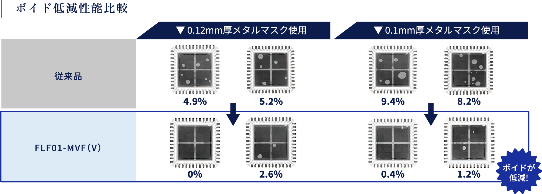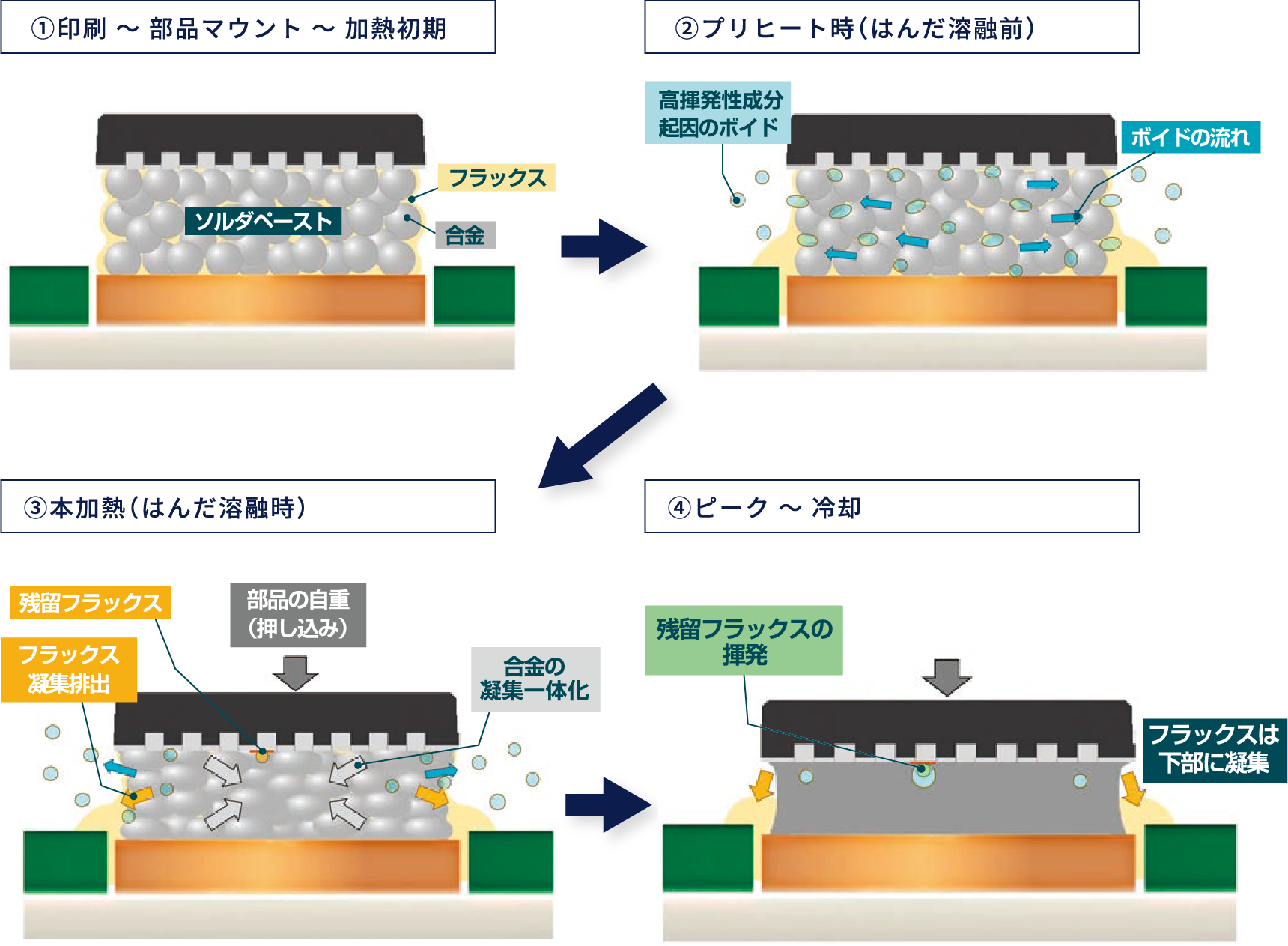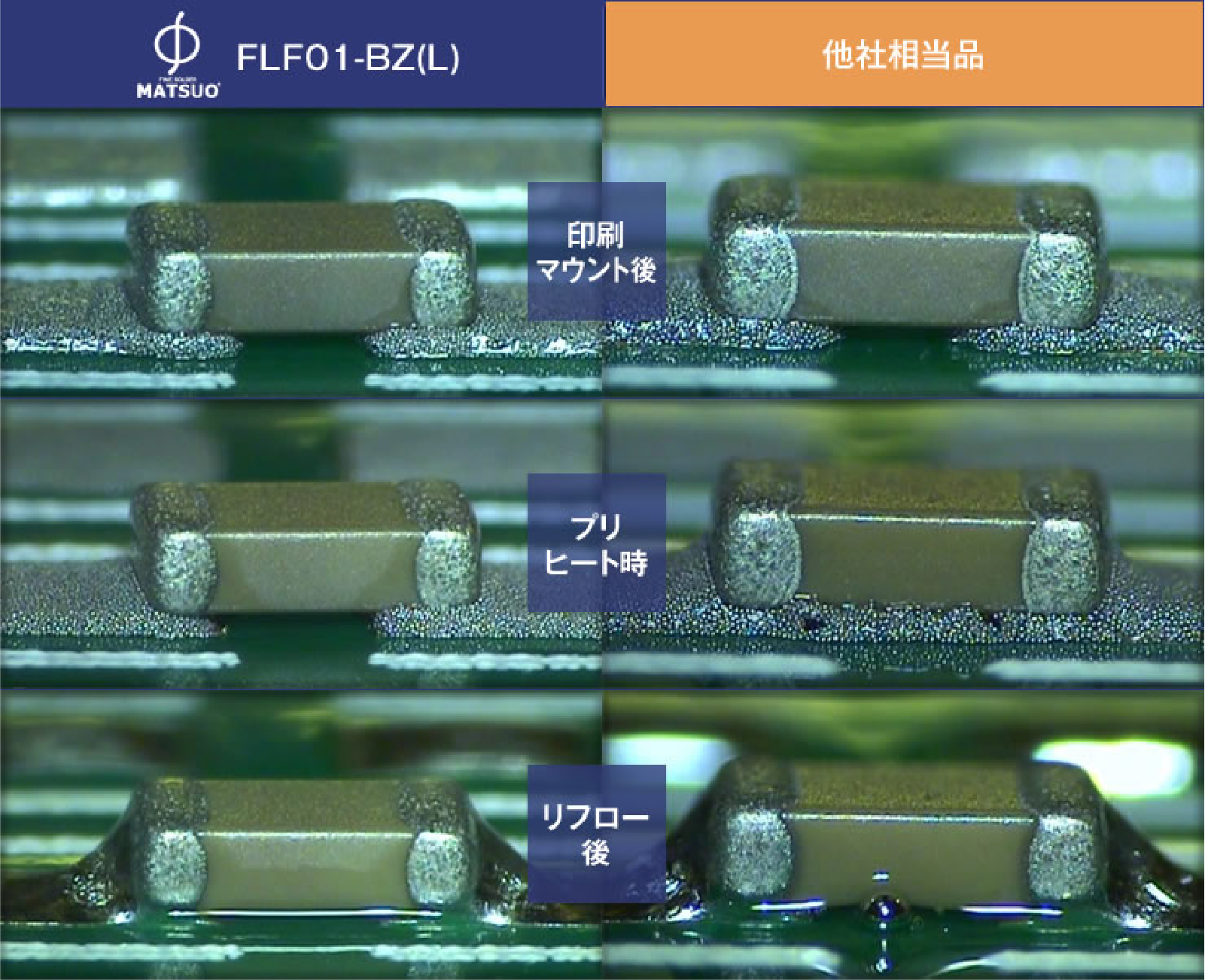 独自のフラックス技術によりプリヒート時のスランプ(部品下やランド外への流れ出し)を抑制することではんだボールの発生を削減することが可能になりました。