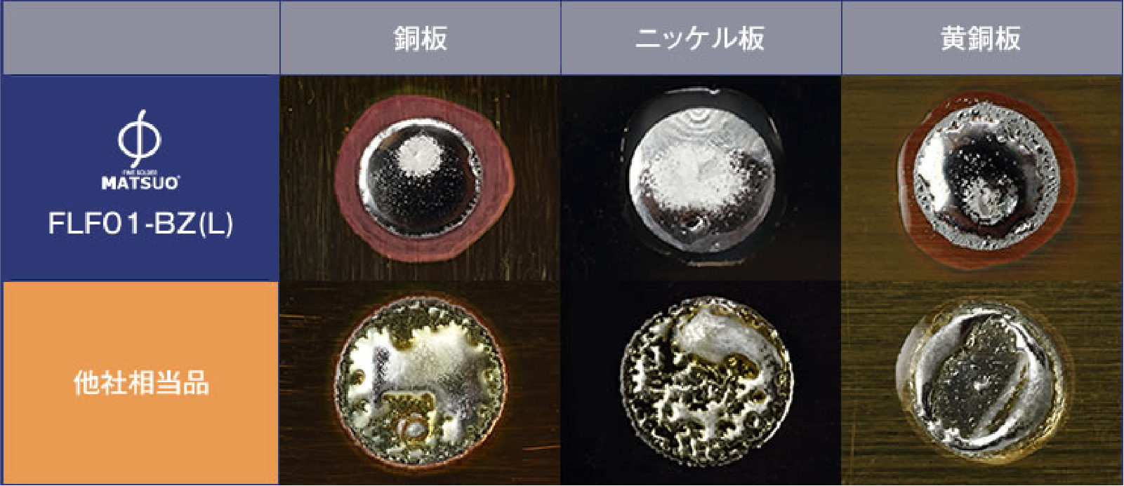 独自の活性剤技術によって銅母材のみならず酸化膜の強固なニッケルや濡れ難い(馴染み難い)亜鉛を含む黄銅にもしっかりと濡れ広がり接合できます。